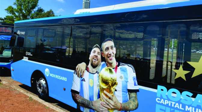 La imagen de algunos de estos buses tienen a los jugadores Lionel Messi y Angel Di María sosteniendo la copa del mundo obtenida en el pasado mundial de futbol en Qatar.