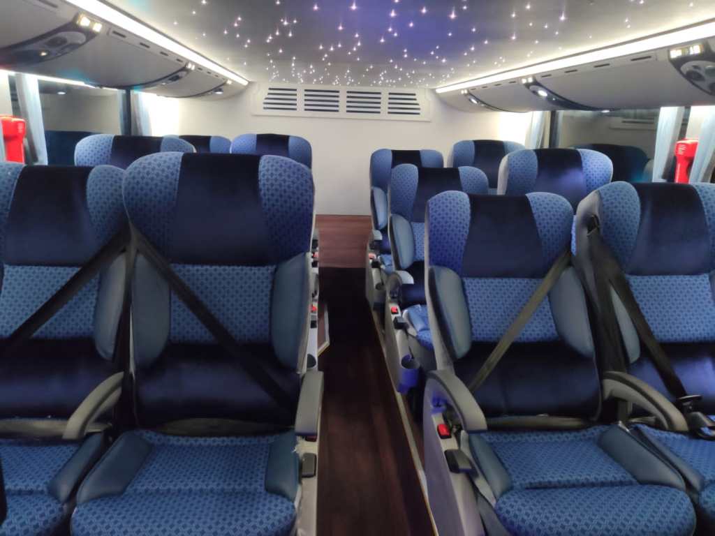 Los asientos ahora tienen tres tipos de espuma y cuatro de tapizado para dar un acabado superior y un alto nivel de comodidad y duración, La base de cada puesto es la espuma moldeada en poliuretano, que recibe otra capa de espuma de confort o “látex” como se le conoce en Perú. Por último, cabecera y zona lumbar cuentan con espuma viscoelástica o “memory foam”, que da se adapta a la forma del cuerpo y mejora el soporte del pasajero, sobre todo en las rutas sinuosas. El tapizado está compuesto por tela automotríz en la parte central, vinilcuero perforado, vinilcuero liso en los laterales y neopreno (terciopelo) en la cabecera.