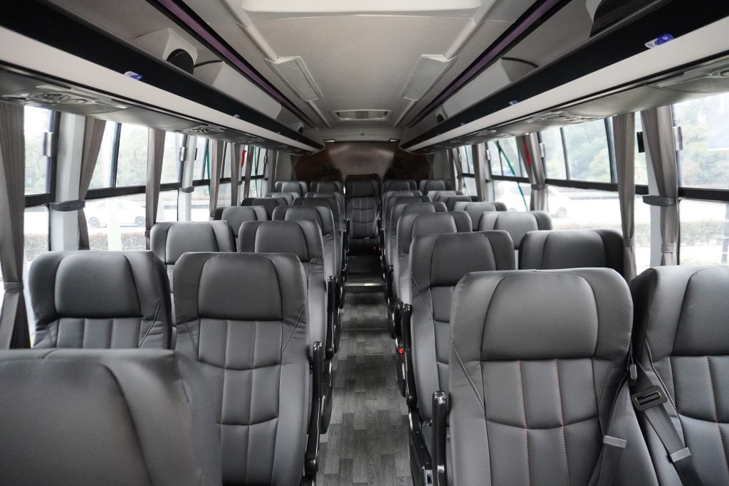 La configuración interior contempla 29 plazas, ampliables hasta 31 según requerimientos del cliente. Los tonos grises y oscuros favorecen una experiencia visual más relajada, acompañados de piso imitación madera e iluminación interior LED, con luces de penumbra y luces individuales de lectura. El diseño del puesto de conducción es uno de los puntos altos del conjunto: paneles bien integrados, escalera con peldaños iluminados, pasamanos ergonómicos y materiales pensados para resistir el desgaste operativo.