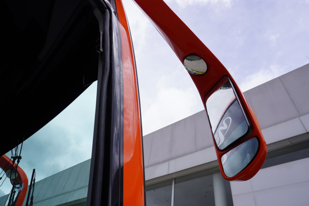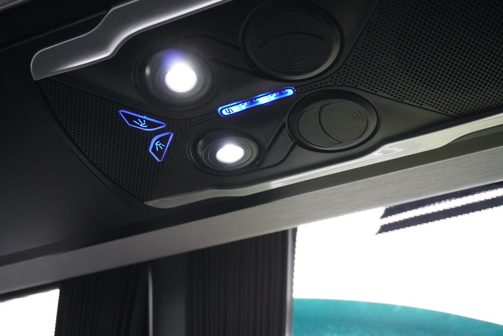 En el área del conductor se concentran los controles de climatización, iluminación y carrocería, junto con un sistema multiplex provisto por Mowin, cargadores de dispositivos, radio con pantalla, palanca de cambios y un completo sistema de cámaras, que en este caso alcanza seis unidades, además de una pantalla de 32 pulgadas con sistema de audio. La seguridad se refuerza con tres salidas de emergencia en el techo.