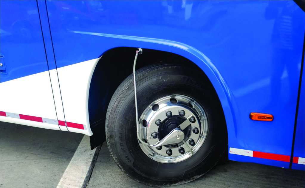 Se trata de un grupo de sensores inalámbricos que van instalados en cada rueda, y que envían su señal mediante ondas de radio o Bluetooth a un receptor en la cabina del bus. Allí puede medirse con facilidad la presión de cada llanta y tomar decisiones ante una contingencia. Su gran desventaja: no permite inflar las ruedas.