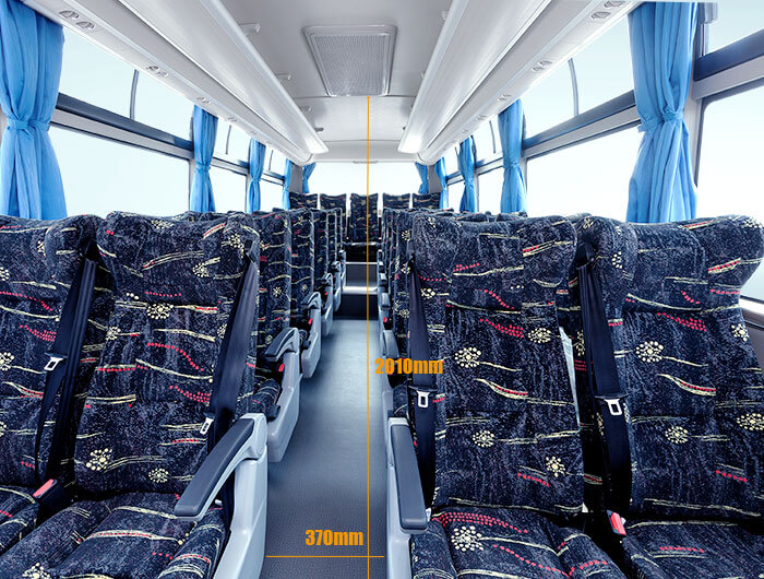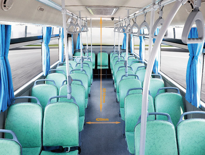 Un pasillo de 370mm en la versión de carretera y 420mm en la urbana facilitan la circulación en el interior del vehículo, donde los ocupantes podrán moverse libremente gracias a una altura de 2 metros en el salón de pasajeros. Butacas de plástico inyectado para el modelo citadino, diseñados con base en la complexión de hombres y mujeres latinoamericanos. También podrá pedirse con el sistema de accesibilidad con mecanismo elevador para las personas con movilidad reducida. Por su parte, la opción de turismo e intermunicipal, está equipada con asientos reclinables con respaldo de espuma de memoria para adaptarse al cuerpo, contribuyendo a viajes más relajados.
