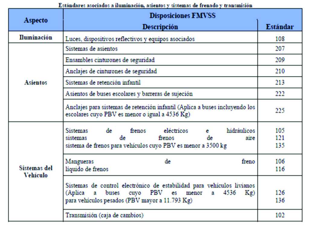 Estándares asociados a iluminación, asientos, frenos y transmisión.