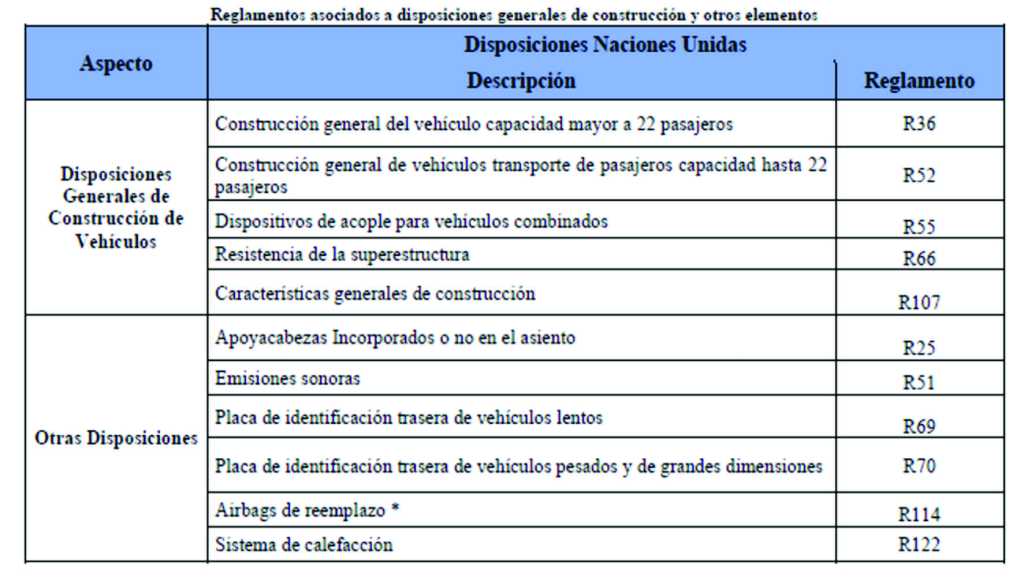 El Reglamento Técnico de la Resolución 3753, hace obligatorias normas internacionales de las Naciones Unidas como el Reglamento 107 (ensayo de estabilidad), el Reglamento 80 (resistencia de anclaje de sillas), el Reglamento 66 (resistencia estructural), y normas específicas para vidrios, frenos, llantas y cinturones, que se suman a más de 52 requisitos técnicos de las NTC5206 y 4901 adicionando aspectos tales como dimensiones, pesos, prevención de riesgos de incendio, accesibilidad y seguridad.
