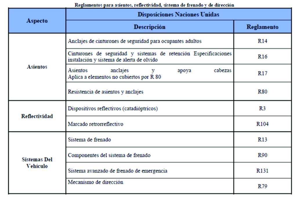 Reglamento para asientos, reflectividad, sistemas de frenado y de dirección.