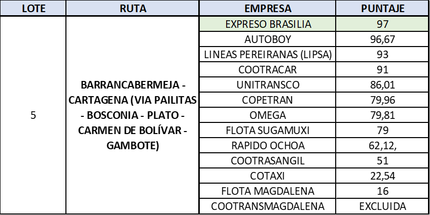Las dos empresas que estuvieron en punta, no desentonaron e incluso Autoboy logró puntuación perfecta para el corredor Yopal – Tunja, Lipsa estuvo cerca de quitarle el segundo lugar a Flota La Macarena que lo mantuvo por dos escasos puntos, pero le faltó acreditar la experiencia específica y Omega superó a compañías de mayor tradición en el recorrido.
