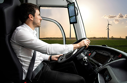 Además, el Irizar i6S Efficient ofrece la opción de sustituir los espejos retrovisores por cámaras de visión digital, con el doble objetivo de proporcionar una visión de gran ángulo en cualquier condición meteorológica. También generan menor rozamiento aerodinámico, permitiendo mejor penetración y ahorro de combustible, además de cumplir el objetivo de mejorar el campo de visión directa e indirecta del conductor.