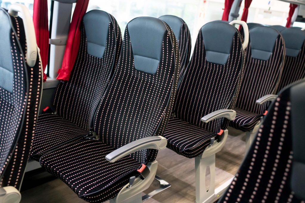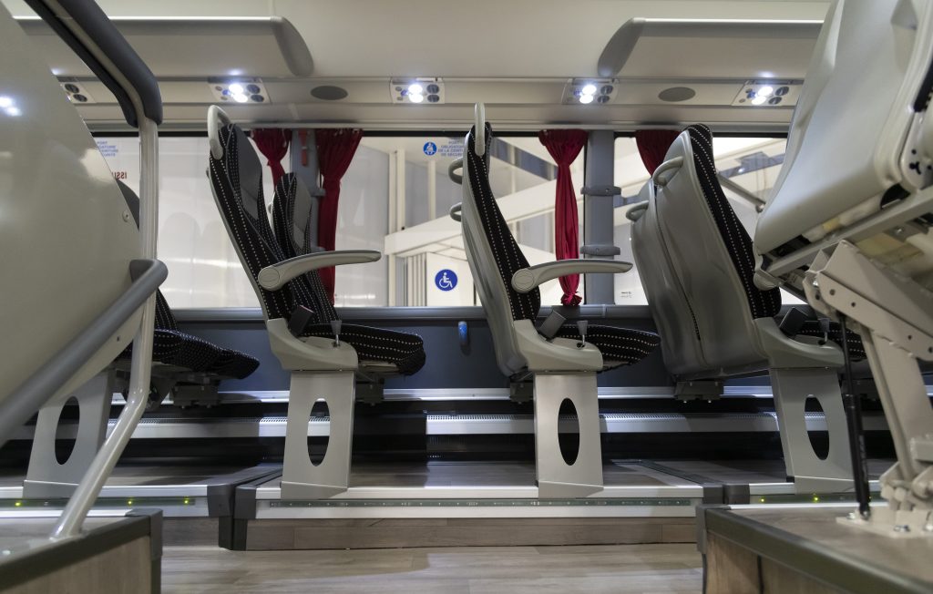 Para la seguridad de los ocupantes y de otros usuarios de las vías, el autobús cuenta con el paquete de seguridad activa ADAS, con la alerta de cambio involuntario de carril (LDW), el frenado automático de emergencia (AEB), el control de crucero adaptativo inteligente (AICC) y el programa electrónico de estabilidad (ESP).