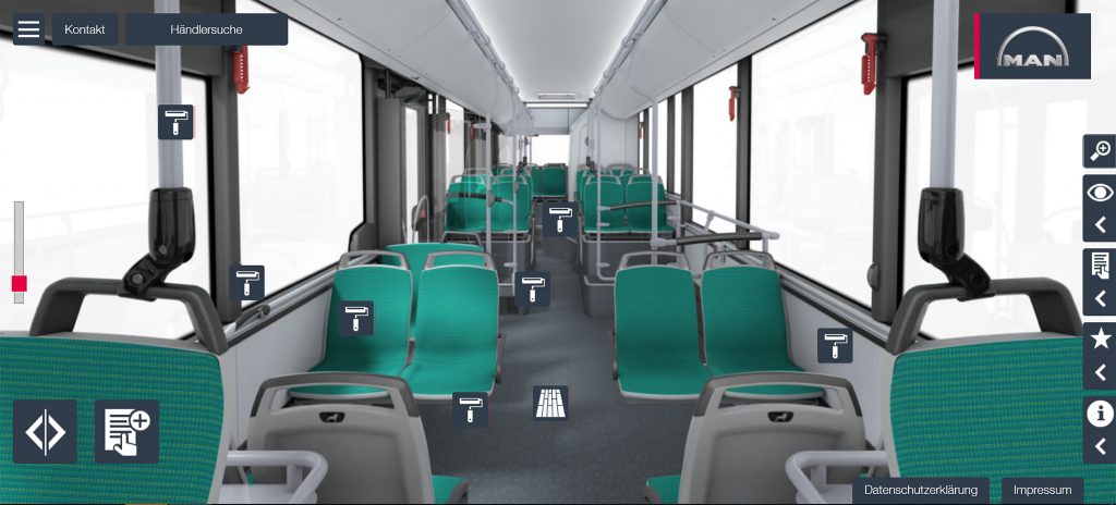 Si un cliente desea asesoramiento o tiene alguna pregunta sobre su configuración, un experto de MAN Truck & Bus puede brindarle asistencia inmediata. El contacto se establece mediante la nueva función Cloud TV. “ Para muchas empresas de autobuses y autocares, el diseño de sus vehículos es absolutamente crucial. Una apariencia que coincide con su diseño corporativo, una atmósfera atractiva y cómoda y accesorios convenientes son, en última instancia, su tarjeta de presentación más importante. La visualización digital de Bus Designer permite a los clientes jugar con todas las opciones hasta que todo sea perfecto “. Finaliza Heinz Keiss.